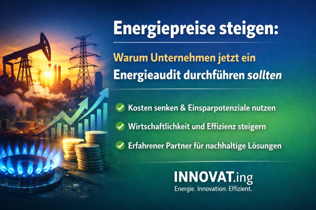 Steigende Energiepreise erhöhen den Druck auf Unternehmen in Deutschland. Ein professionelles Energieaudit nach DIN EN 16247-1 hilft dabei, Energieverbräuche transparent zu machen, Einsparpotenziale zu identifizieren und wirtschaftlich sinnvolle Maßnahmen abzuleiten. Die INNOVAT.ing GmbH unterstützt Unternehmen mit viel Erfahrung bei der Analyse von Strom, Wärme, Prozessen und technischen Anlagen. Gerade in Zeiten volatiler Energiemärkte ist ein Energieaudit ein wichtiger Schritt, um Energiekosten zu senken, Wettbewerbsfähigkeit zu sichern und fundierte Investitionsentscheidungen zu treffen.