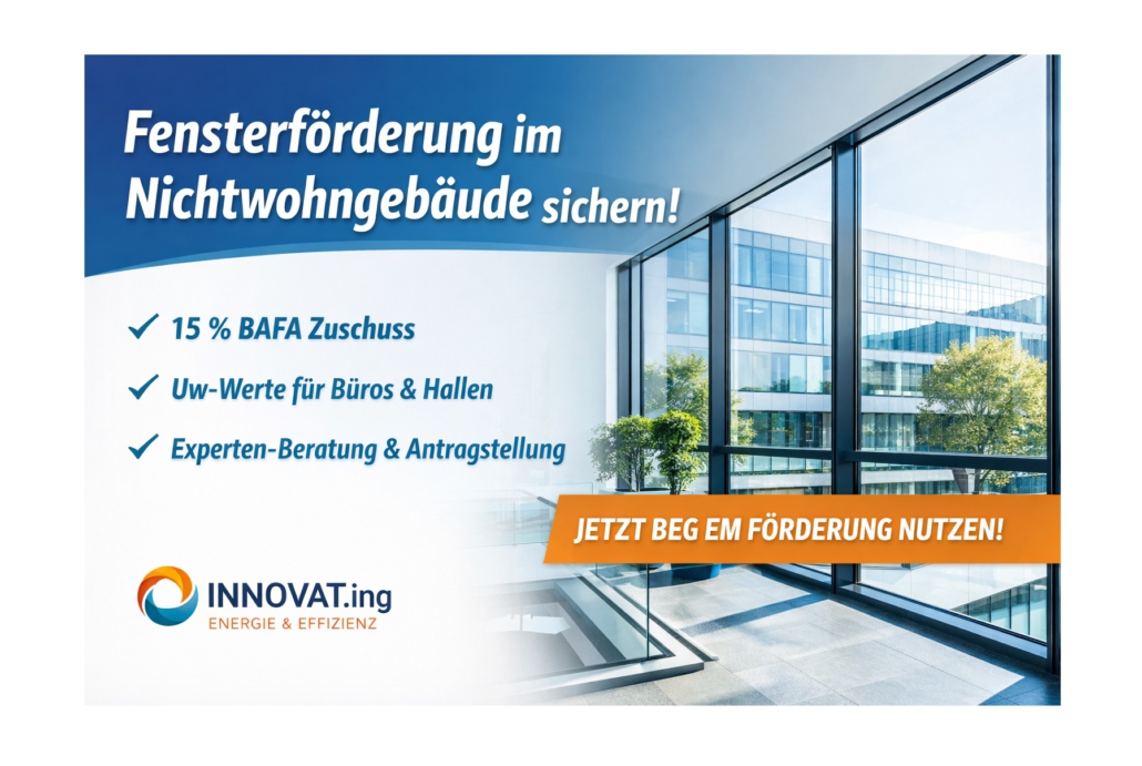 Sie planen einen Fenstertausch im Nichtwohngebäude und möchten die BAFA Förderung sicher nutzen. INNOVAT.ing unterstützt Sie mit Energieaudit, technischer Auslegung und vollständiger Antragsbearbeitung.