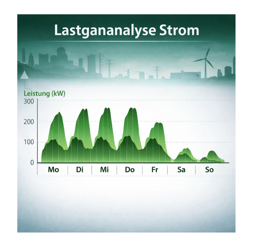 Eine Lastganganalyse (Lastprofil) macht sichtbar, wie sich die Leistung über Zeit verhält – typischerweise auf Basis von 15-Minuten-Werten aus der registrierenden Leistungsmessung (RLM). Damit erkennt man nicht nur wie viel verbraucht wird, sondern wie der Verbrauch zustande kommt.